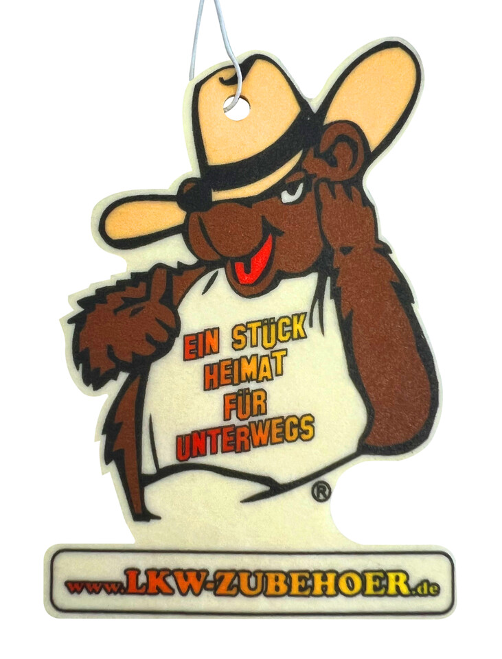 Duftbaum als brauner Cartoon-Bär mit Hut und T-Shirt. Auf dem Shirt steht 'EIN STÜCK HEIMAT FÜR UNTERWEGS'. Unten: LKW-ZUBEHOER.de.