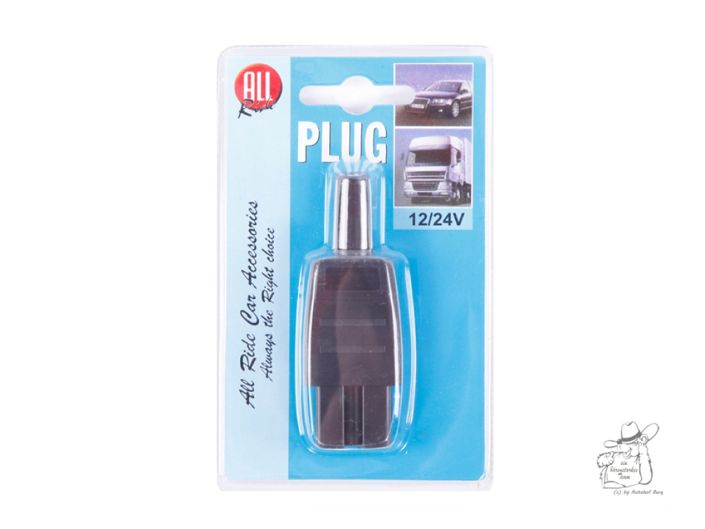 Graue Steckkupplung für 12/24V in Blisterverpackung. Aufschrift PLUG.