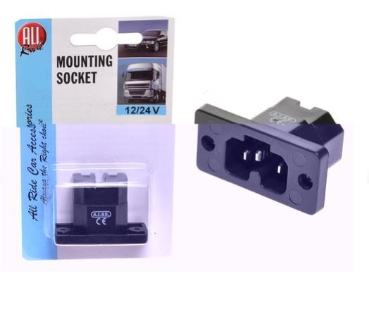 Schwarze Einbausteckdose mit rechteckiger Form und zwei Befestigungslöchern. Eine 12/24V-Kennzeichnung und das CE-Zeichen sind sichtbar.