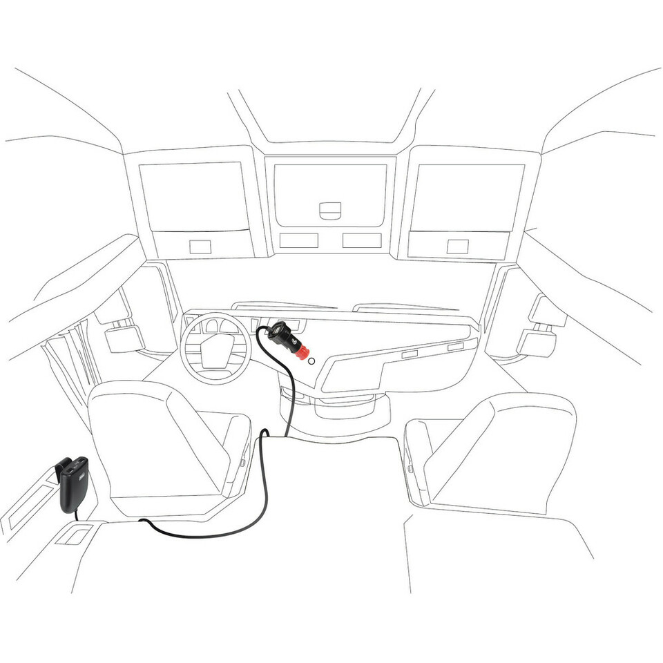 Schwarzes USB-Ladegerät mit Stecker und roter Kontrollleuchte, über Verlängerungskabel in LKW-Kabine angeschlossen.
