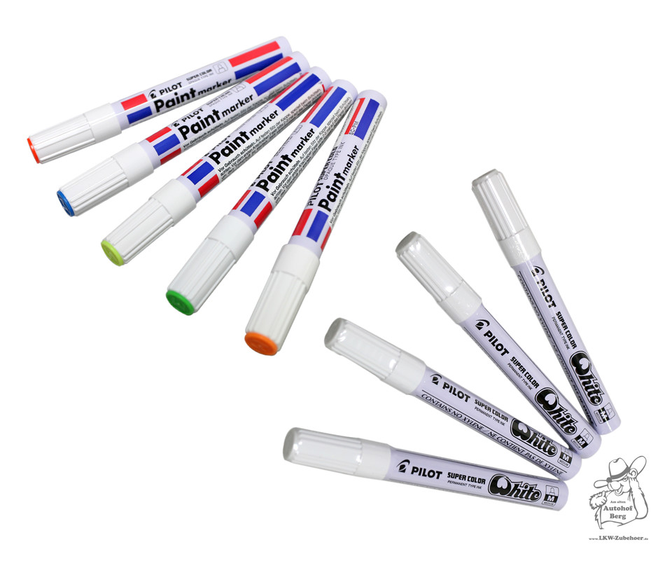 Mehrere Pilot Reifenmarker mit farbigen Kappen und weiße Pilot Super Color Marker auf weißem Hintergrund.