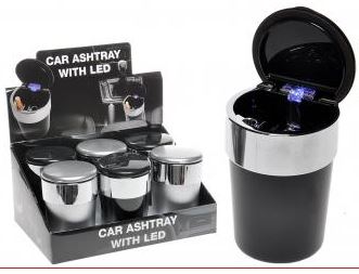 Schwarze Aschenbecher mit Chromdeckel im Display und ein geöffneter Aschenbecher mit blauem LED-Licht.