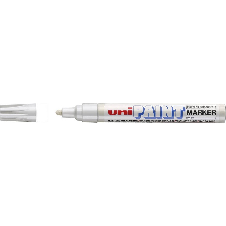 Weißer UniPaint Reifenmarker mit Rundspitze und abgenommener Kappe.