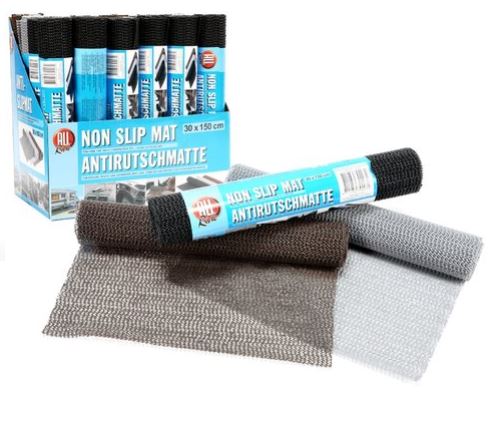 Antirutschmatten 30x150cm in Braun, Grau und Schwarz, gerollt und ausgebreitet, mit Displaybox.
