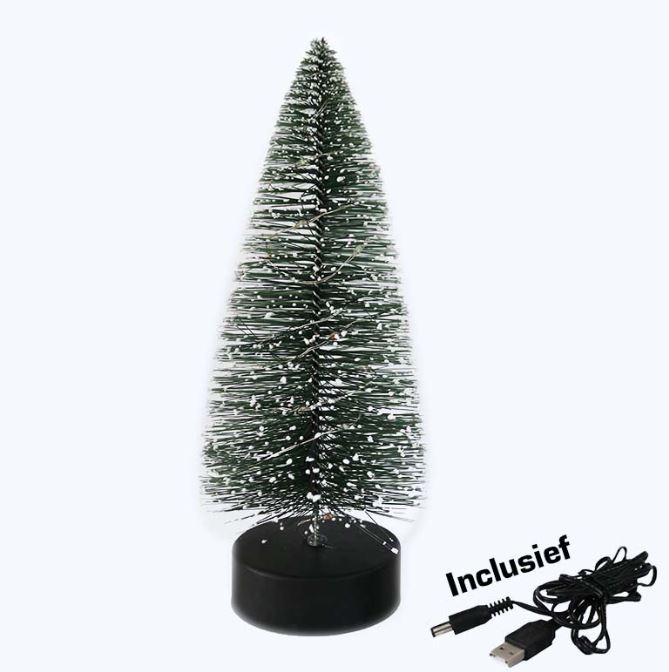 Scandi LED-Weihnachtsbaum mit Kunstschnee auf schwarzem Sockel und beiliegendem USB-Kabel.