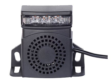 Schwarzer Rückfahralarm mit leuchtendem orangefarbenem LED-Blitzer und Lautsprechergitter.