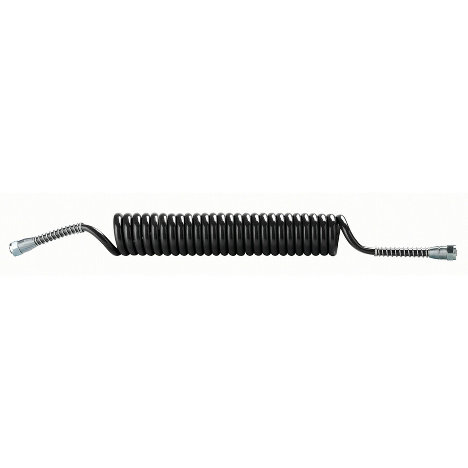Schwarzer Luftspiralschlauch mit metallverstärkten Anschlüssen an den Enden.