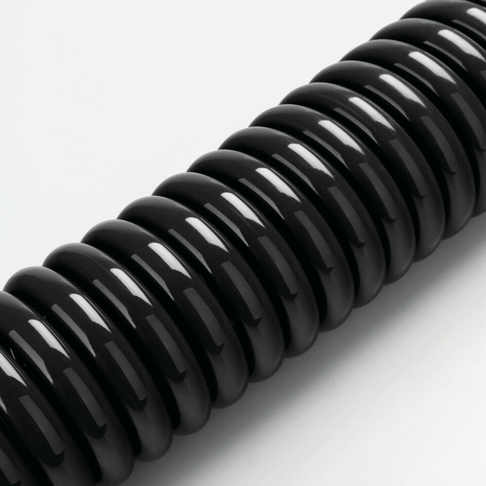 Nahaufnahme eines schwarzen Luftspiralschlauchs mit glänzender Oberfläche auf weißem Hintergrund.