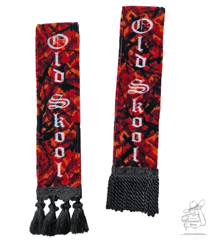 Zwei rote Plüsch-Minischals mit 'Old Skool' Schriftzug, einer mit Bommeln, der andere mit Fransen.