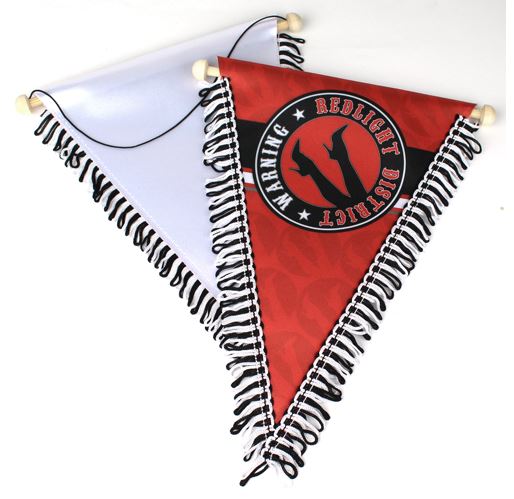 Wimpel "Red Light District", rot mit Beinen in High Heels und Fransenborte. Die Rückseite ist weiß.