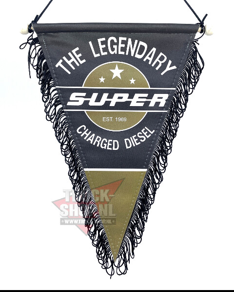 Schwarzer Wimpel mit weißem Aufdruck "The Legendary Super Charged Diesel" auf goldfarbenem Hintergrund und Fransenborte.