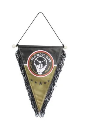 Dreieckiger Wimpel Old Skool Club in Schwarz und Olivgrün mit Fransen. Das Logo zeigt ein Lenkrad, ein Handzeichen und Sterne.