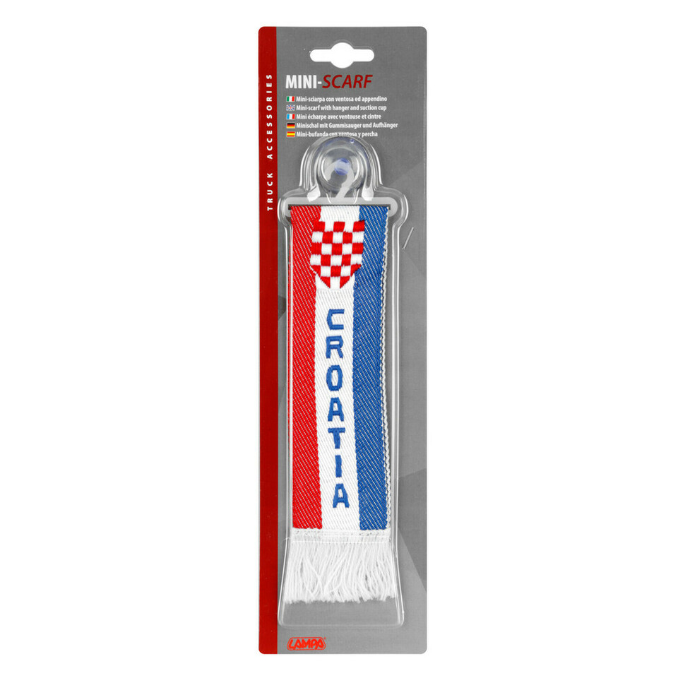 Minischal Kroatien mit Saugnapf und Bügel. Rot-weiß-blauer Stoff mit Schachbrettmuster, 'CROATIA' Schriftzug und Fransen.
