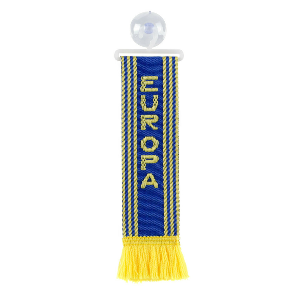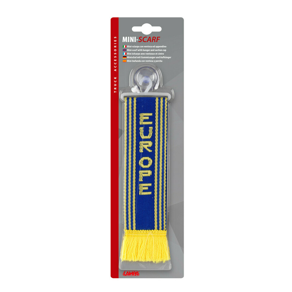 Blauer Minischal mit gelben Streifen und Fransen, Aufschrift 'EUROPE', mit Saugnapf und Bügel.