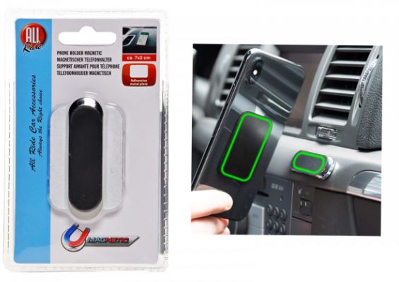 Schwarzer magnetischer Handyhalter und ein Smartphone mit angebrachter Halterung im Auto.