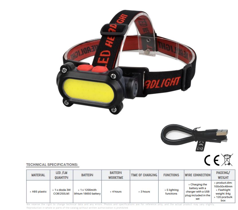Schwarze Stirnlampe aus ABS-Kunststoff mit rotem Band, Aufschrift "LED HEADLIGHT" und USB-Ladekabel.