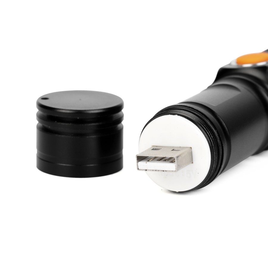 Schwarze LED-Taschenlampe mit freigelegtem USB-Anschluss und abgenommener Endkappe.