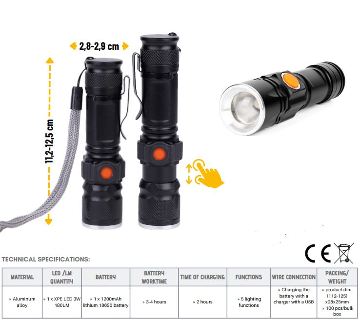 Taschenlampe LED + Akku inkl. USB Anschluss