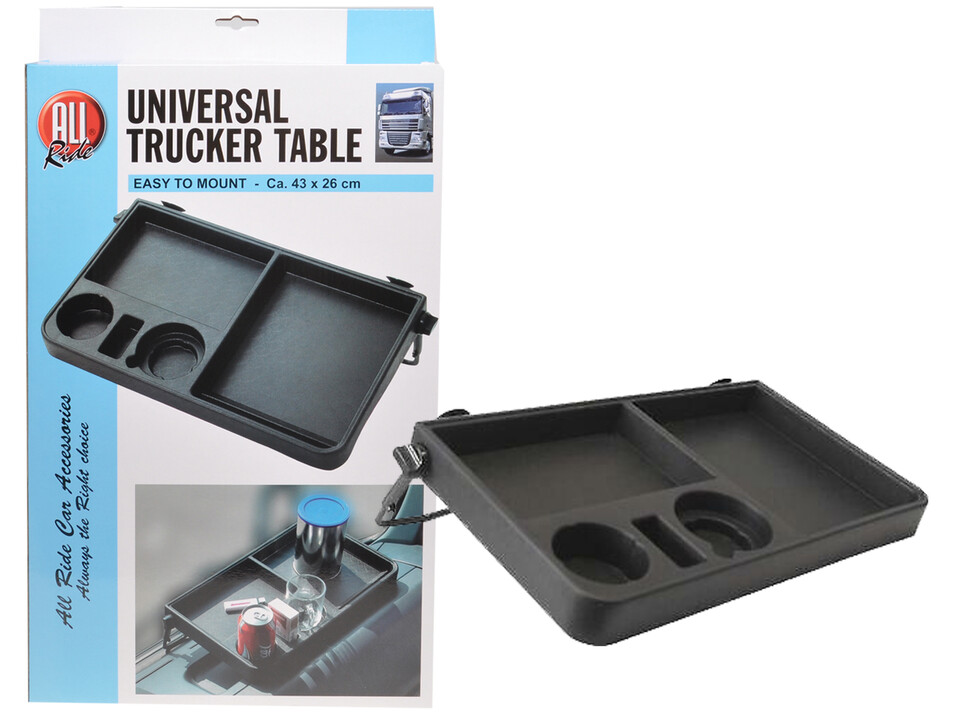 Schwarzer Universal Trucker Table aus Kunststoff mit Fächern und Saugnäpfen.