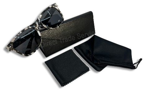 Sonnenbrille mit schwarz-weißem Muster, schwarzem Brillenetui, Putztuch und Beutel.