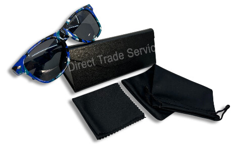 Blau-gemusterte Sonnenbrille mit dunklen Gläsern, schwarzem Hartschalenetui, Stoffbeutel und Putztuch.