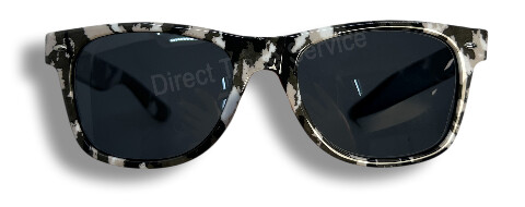 Sonnenbrille mit Camouflage-Muster in Schwarz, Grau und Weiß, seitlich auf weißem Hintergrund.