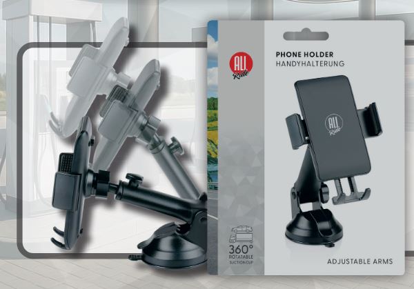 Schwarze Handyhalterung mit Saugnapf, 360° verstellbar, auf Verpackung und in verschiedenen Ansichten.