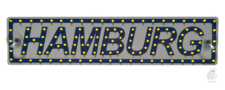 Graues Namensschild mit blauem, beleuchtetem Rand und gelben LEDs, zeigt "HAMBURG", mit Saugern.