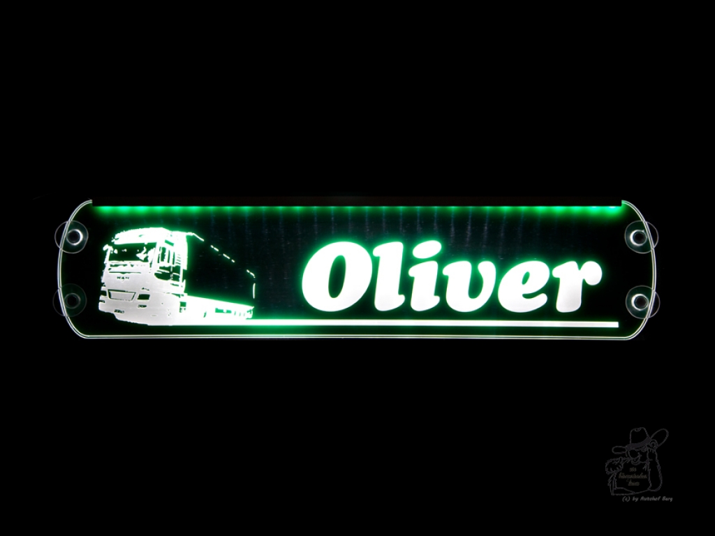 LED beleuchtetes Namensschild aus Acryl mit LKW-Motiv und dem Namen 'Oliver', grün leuchtend, mit Saugnäpfen.
