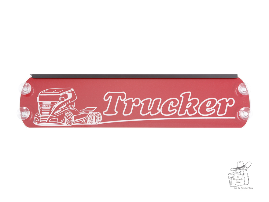 Rotes LED-Namensschild mit weißer "Trucker"-Gravur, LKW-Motiv und Saugnäpfen.