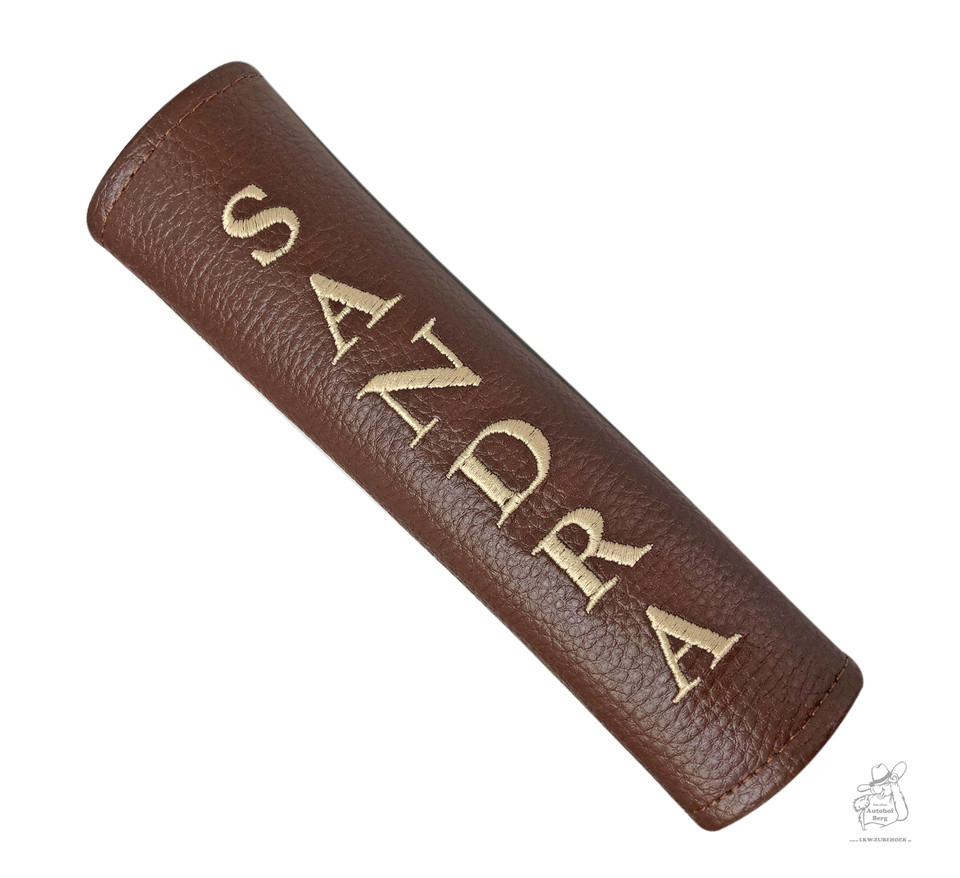 Brauner Kunstleder-Gurtschoner mit goldfarben gesticktem Namen