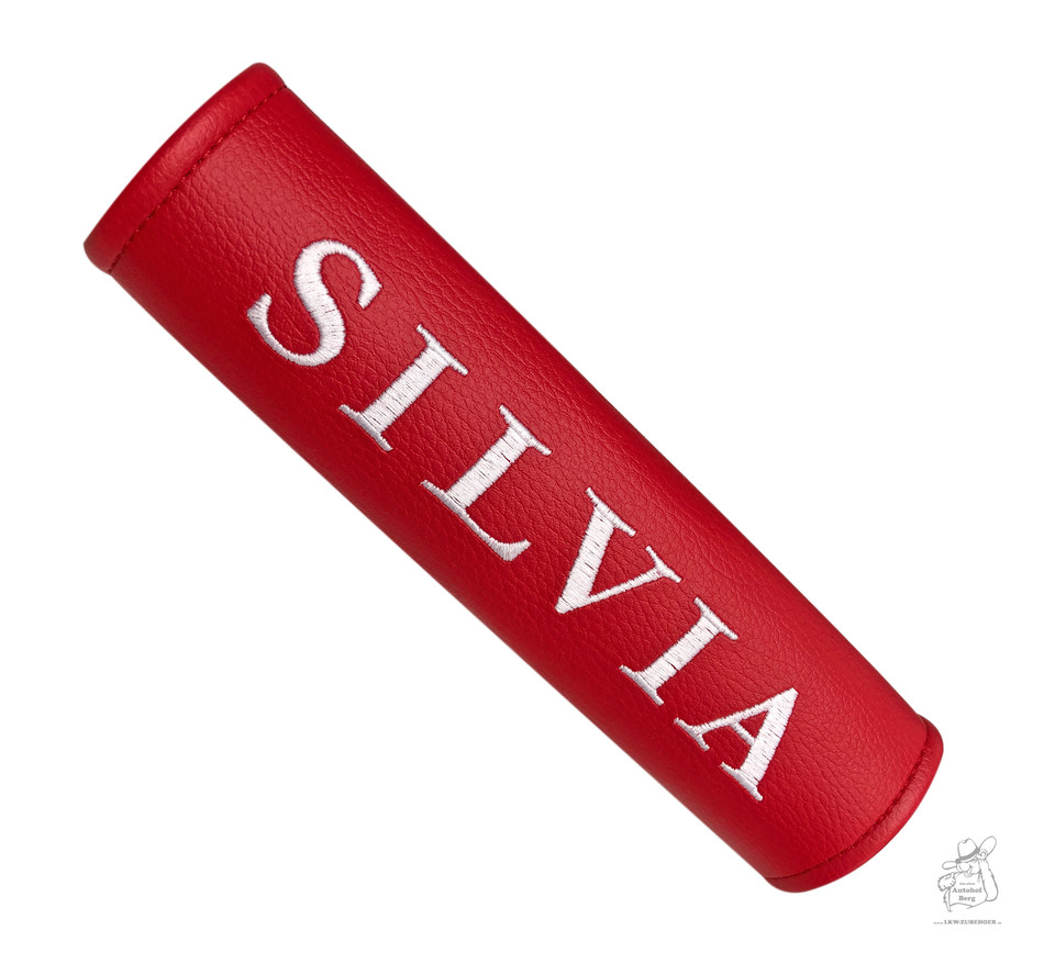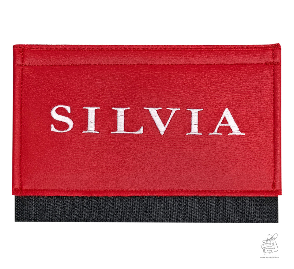 Roter Gurtschoner aus Kunstleder mit dem gestickten Namen 'SILVIA' in Weiß.