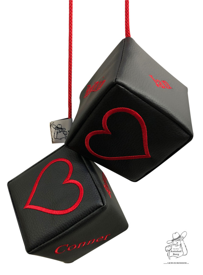 Ein Paar schwarze Kunstleder-Würfel mit roter Stickerei von Herzen und Namen, an roten Schnüren hängend.