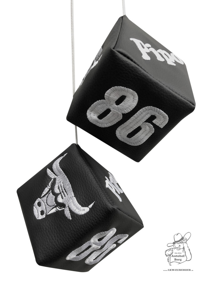 Ein Paar schwarze Kunstleder-Würfel mit weißer Stickerei, darunter 'King', '86' und ein Stierkopf-Motiv, hängen an einer Schnur.
