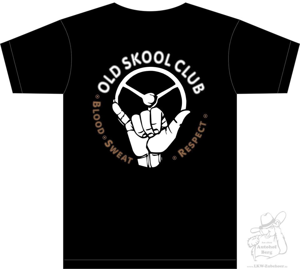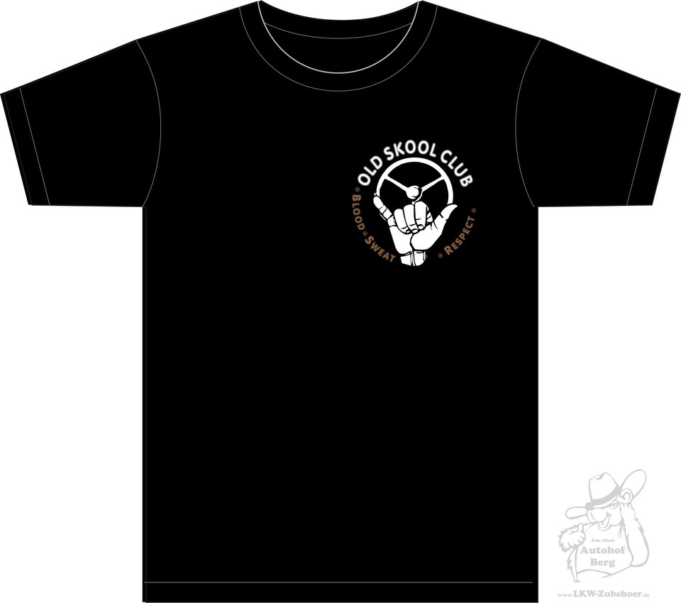 Schwarzes T-Shirt mit weißem Brustdruck: 'OLD SKOOL CLUB' Logo mit Lenkrad und Hand. Umrandet von 'BLOOD • SWEAT • RESPECT'.