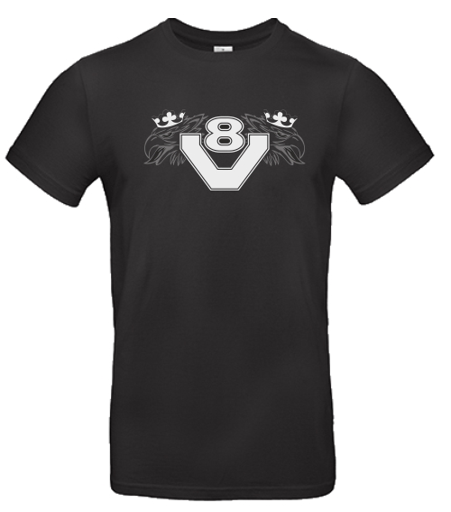 Schwarzes Baumwoll-T-Shirt mit weißem V8-Logo, flankiert von gekrönten Vogelköpfen.