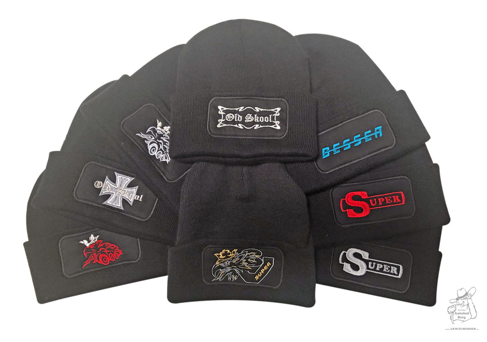 Mehrere schwarze Wintermützen mit verschiedenen Stickereien im Patchfeld, darunter "Old Skool" und "BESSER".