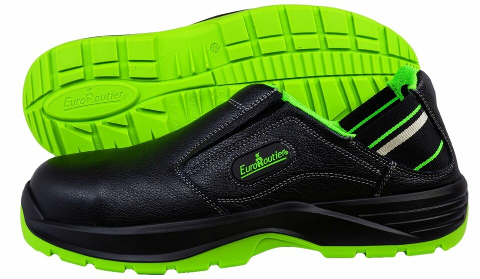 EuroRoutier Hybrid Safety Clogs aus schwarzem Nappa Leder mit leuchtend grünen Sohlen und Akzenten.