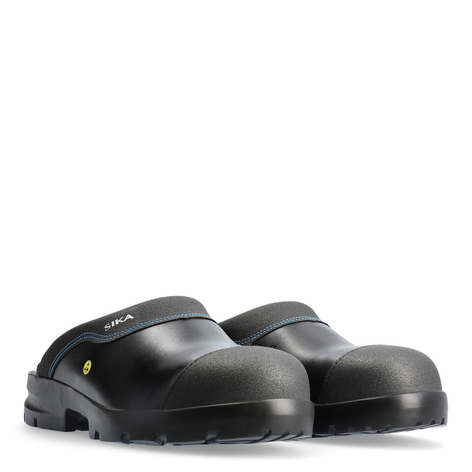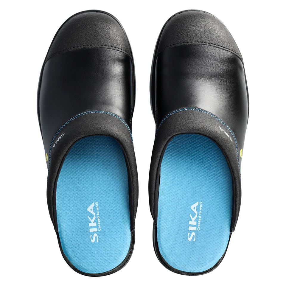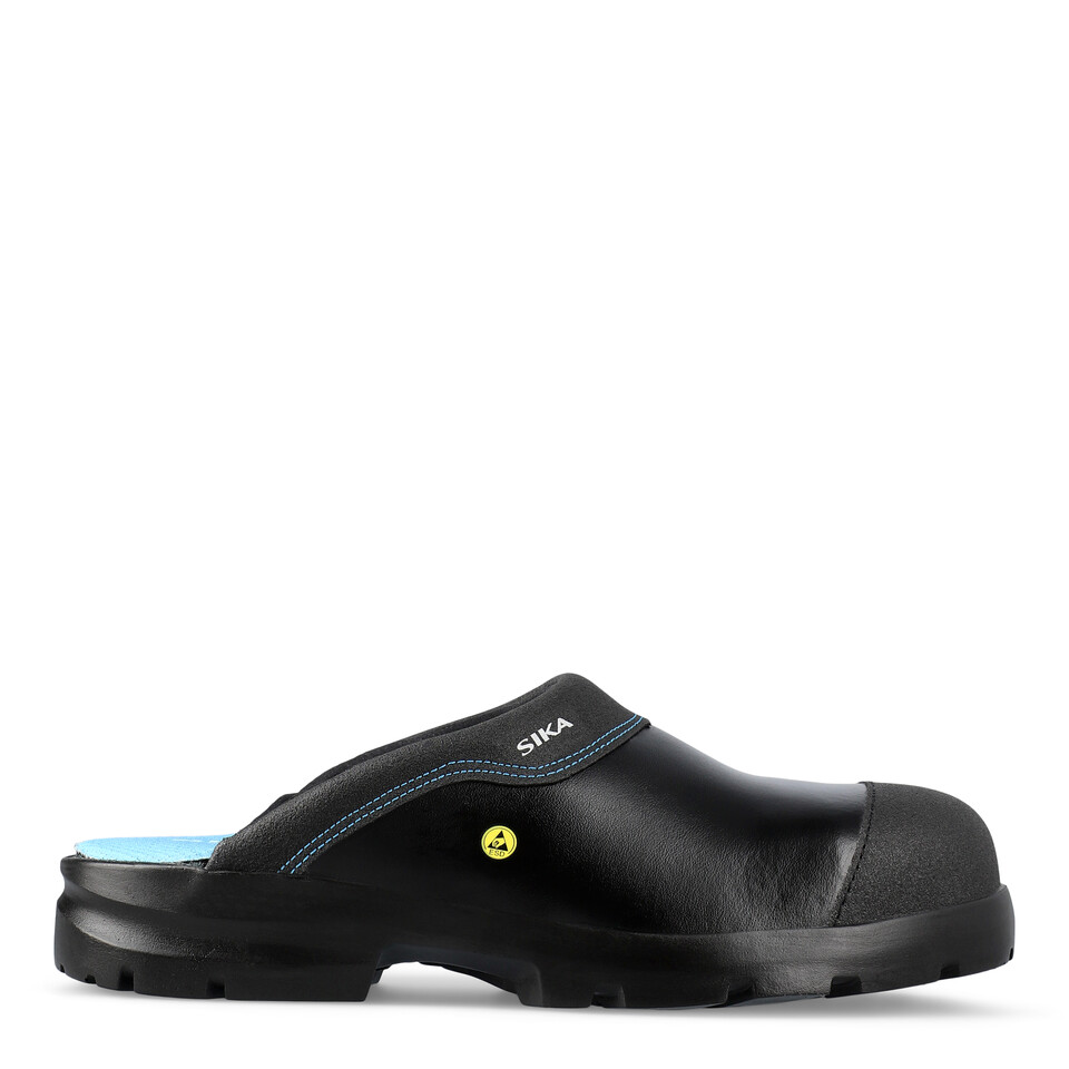 Schwarze SIKA Arbeitsclogs aus Permair® Leder mit blauen Kontrastnähten, blauer Innensohle und robuster Pronose. ESD-Logo sichtbar.