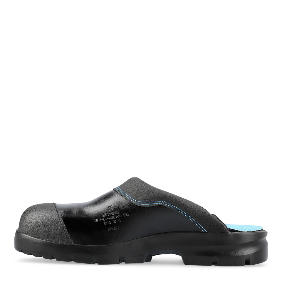 Schwarze SIKA Arbeitsclogs "Flex Light" offen, aus Leder mit blauen Nähten, Pronose und ESD-Symbol.