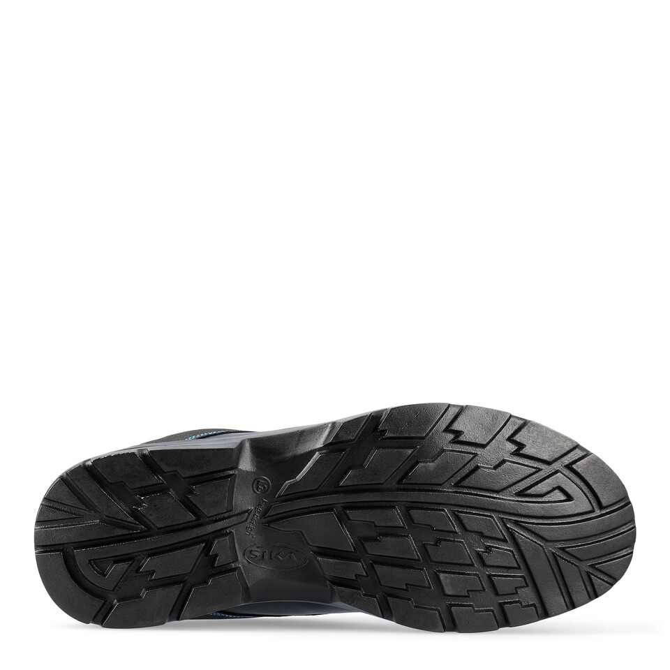 Schwarze, rutschhemmende Laufsohle eines SIKA Arbeitsclogs mit tiefem Profil und SIKA-Logo.