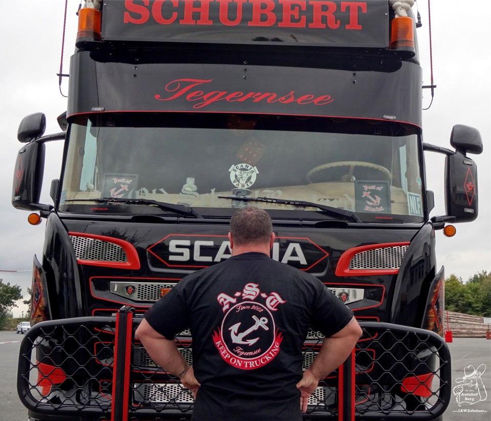 Rückenansicht eines Mannes in schwarzem AST Fan Shirt mit weiß-rotem Anker-Logo und 'Keep on Trucking' Schriftzug.