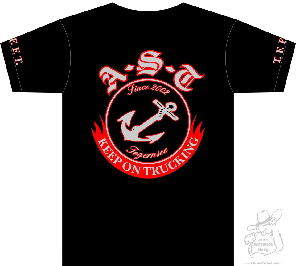 Schwarzes AST Fan Shirt aus Baumwolle mit rotem Anker-Logo, "Keep on Trucking" und T.E.F. Schriftzug.