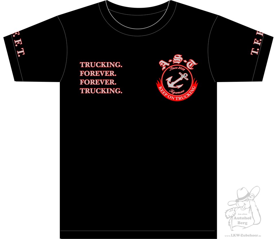 Schwarzes AST Fan Shirt aus Baumwolle mit rotem Anker-Logo und "TRUCKING FOREVER" Text.