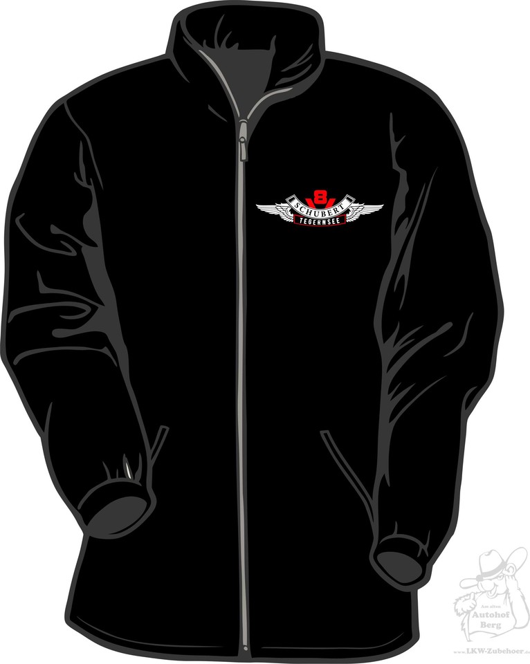 Schwarze Fan-Jacke mit detailreichem Aufdruck eines braunen Scania LKWs. Inschrift: 'Schubert', 'Trucking Forever', 'Tegernsee'.