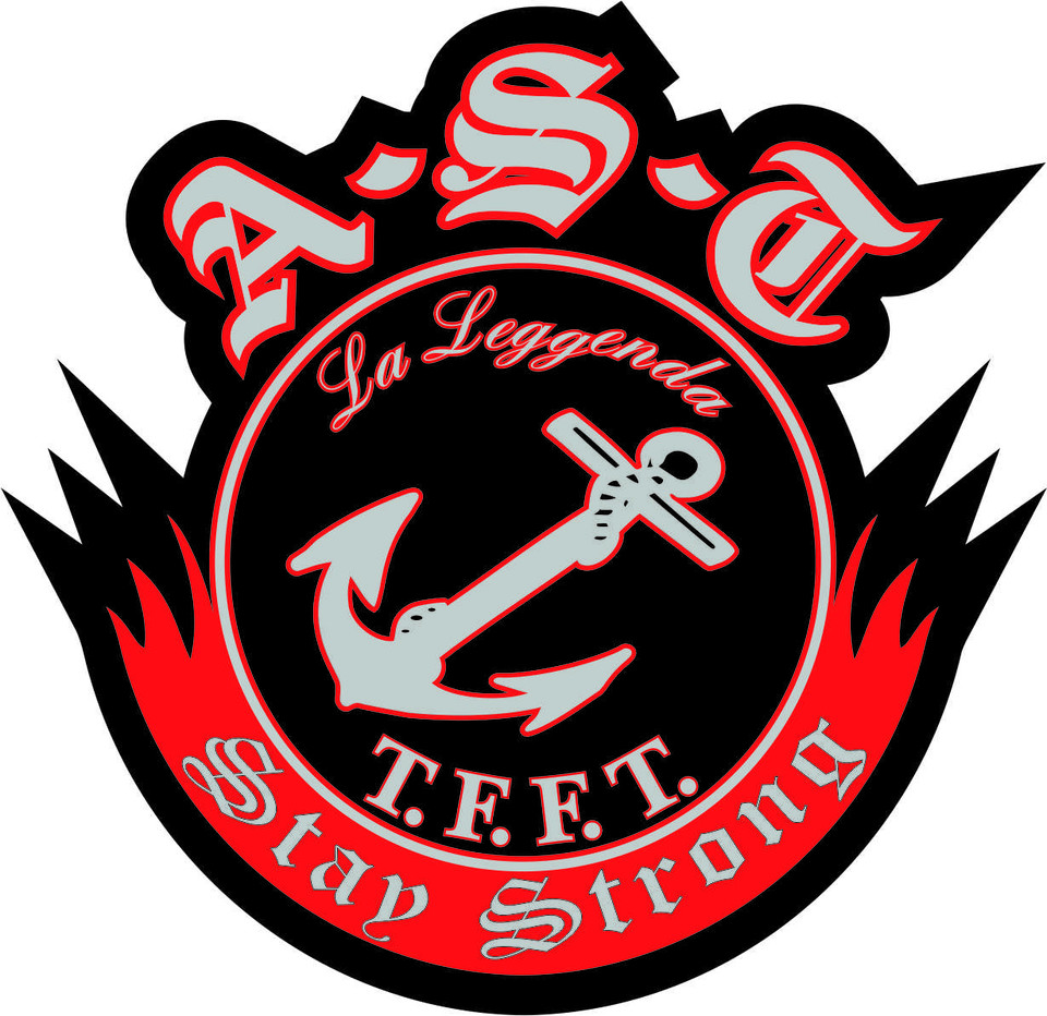 Runder schwarzer Aufkleber mit rotem Rand, grauem Anker und den Schriftzügen 'A.S.T.', 'La Leggenda' und 'Stay Strong'.