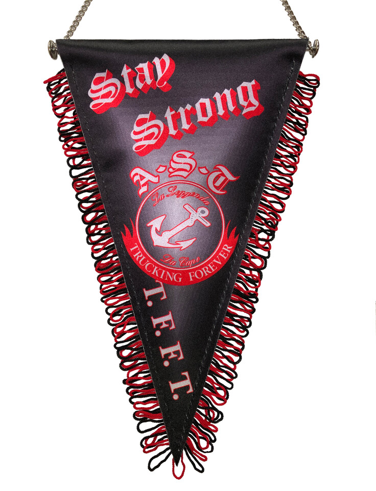 Schwarzer AST Stay Strong Wimpel mit roter Schrift, Anker-Logo, "TRUCKING FOREVER" und roten/schwarzen Fransen.