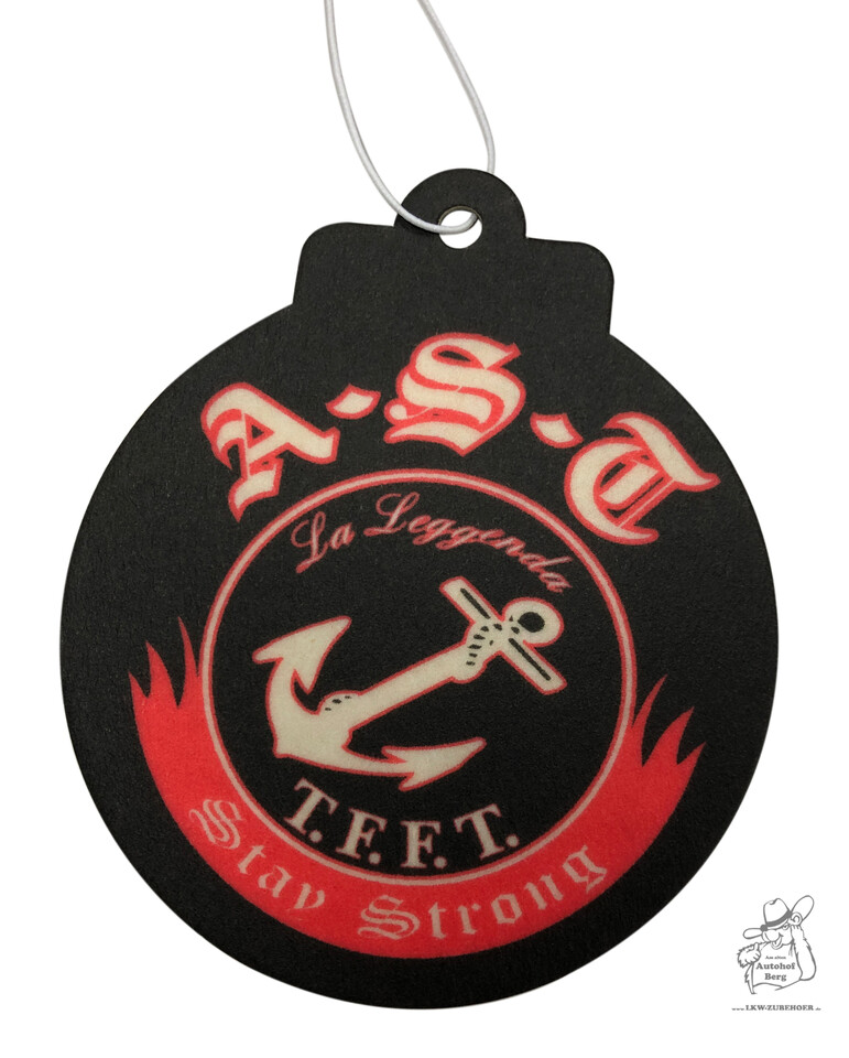 Schwarzer Lufterfrischer in Ornamentform mit rotem und weißem A-S-A und Stay Strong Schriftzug sowie Anker-Motiv.