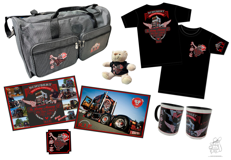 AST Fanpaket: Graue Reisetasche, schwarze T-Shirts, Plüschbär, weiße Tassen, Plakate und Aufkleber mit LKW-Design.