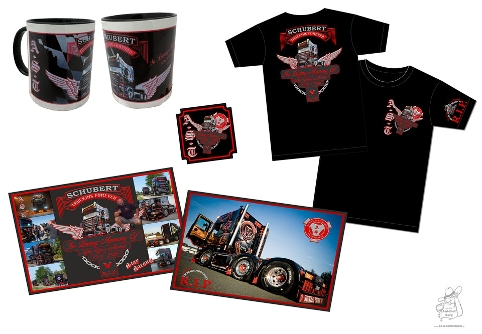 Schwarzes AST Fanpaket mit T-Shirt, Tasse, Aufkleber und Plakaten. Alle Artikel zeigen LKW-Motive und Gedenk-Schriftzüge.